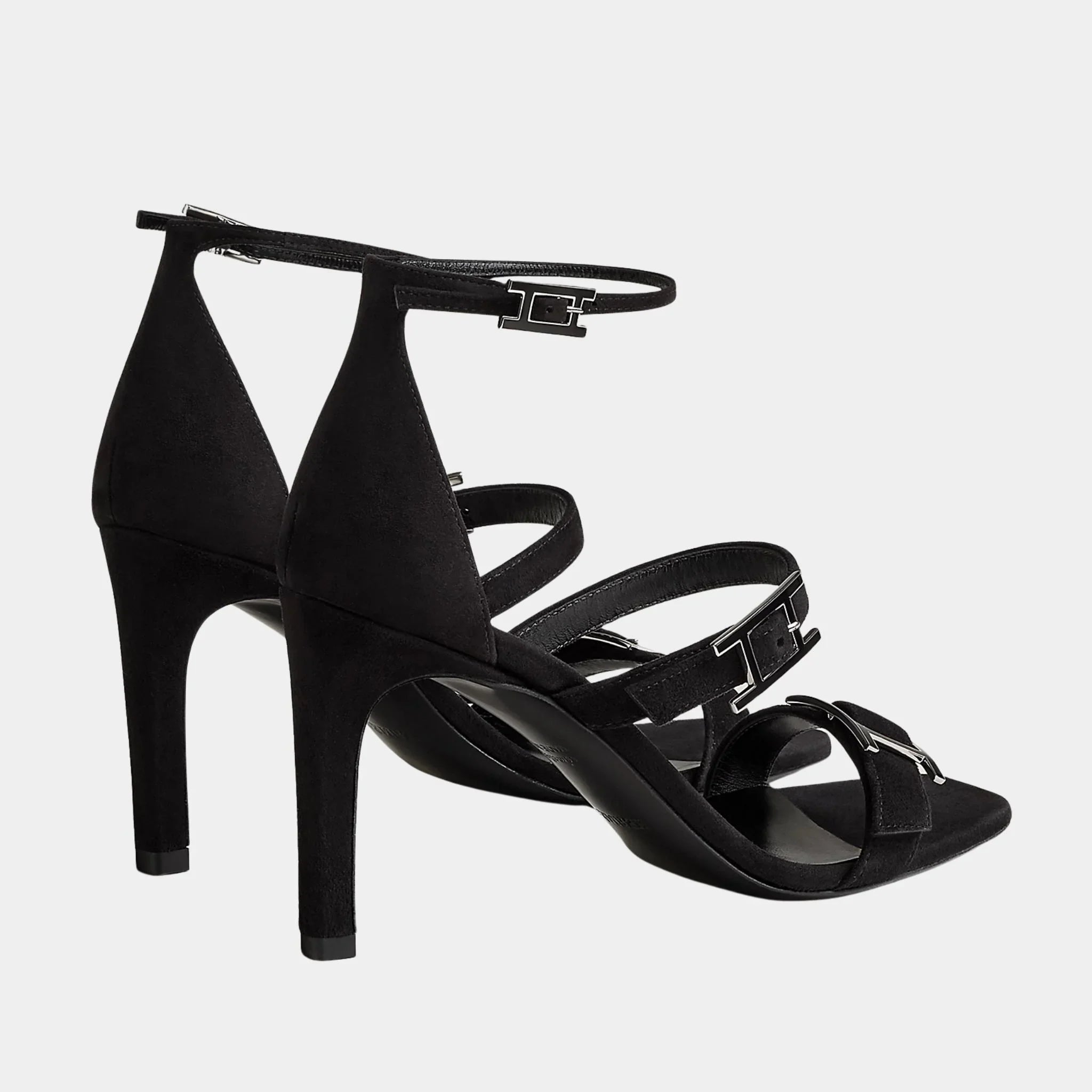 Hermes Liv 90 High Heel Sandal in Suede Goatskin, Noir, Front Liv 90 High Heel Sandal in Suede Goatskin