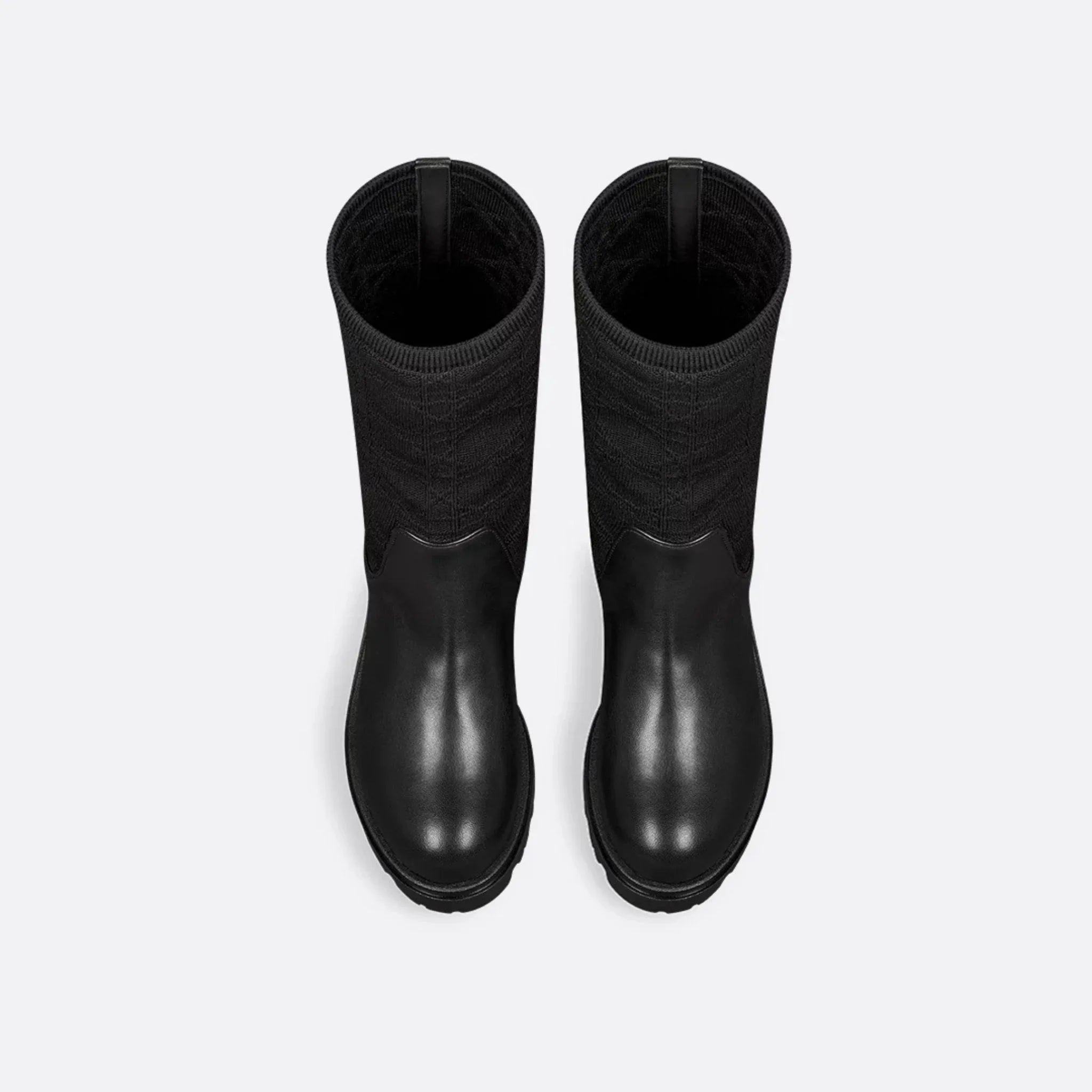 This boot is designed with a high-top upper that pairs smooth black calfskin with the stretch jacquard knit, providing both structure and flexibility. The leather lining offers comfort, while the black leather insole embossed with the Dior signature adds a touch of luxury. The rubber outsole ensures traction and durability, making it perfect for active days.