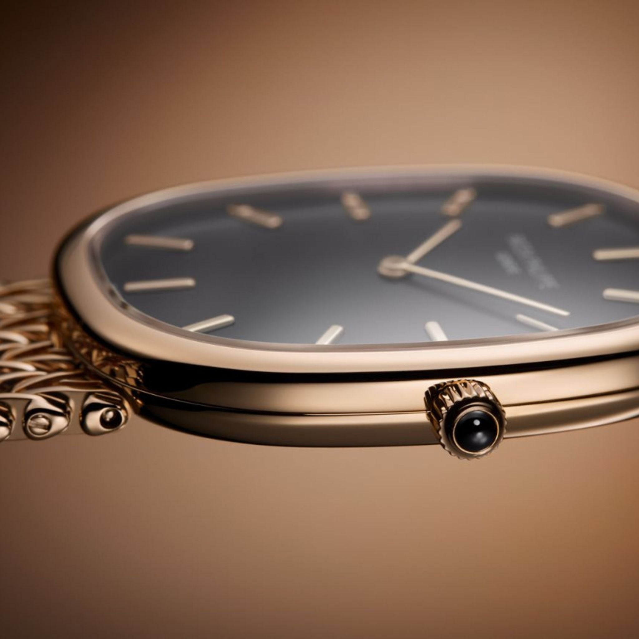 The watch showcases an ebony black sunburst dial, providing a striking contrast to the warm tones of the 18K rose gold case and bracelet. The slender hour markers and hands, also crafted in rose gold, enhance its refined aesthetic. The chain-style bracelet is composed of fine links, offering both suppleness and elegance, and pays homage to the vintage designs of the Golden Ellipse collection.