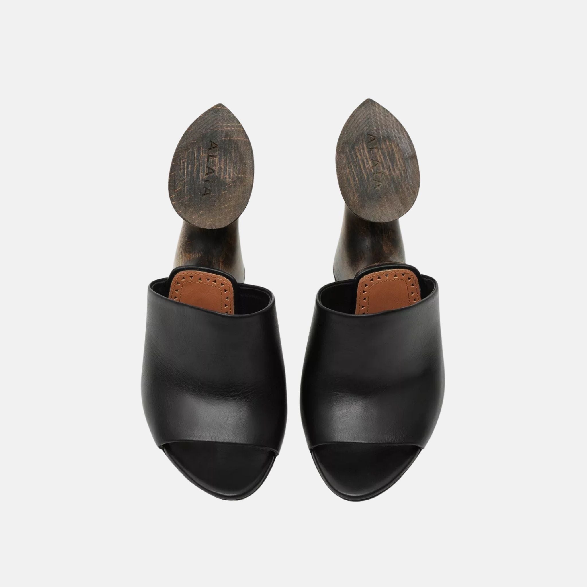 Elevate your footwear collection with the Alaïa La Sculpture Mules In Calfskin And Wood, where timeless elegance meets contemporary artistry.