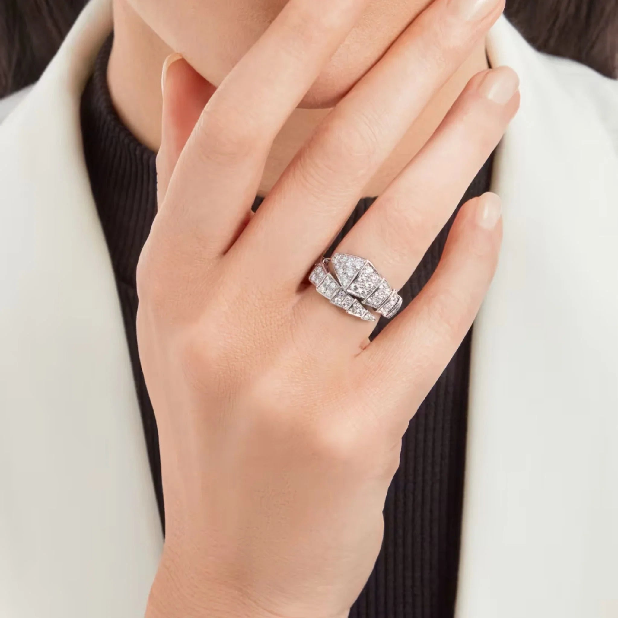 Every detail of the Bvlgari jewellery design highlights expert craftsmanship. The precision-set diamonds create a seamless sparkle that enhances the serpent-inspired curves of the ring. The polished white gold surface adds depth and brilliance, while the sculpted shape ensures both beauty and comfort. Each piece reflects Bvlgari’s heritage of Italian artistry and innovation, offering a refined blend of strength and elegance. Loved throughout the UAE, this ring is more than jewellery — it’s a timeless symbol of luxury and individuality.
