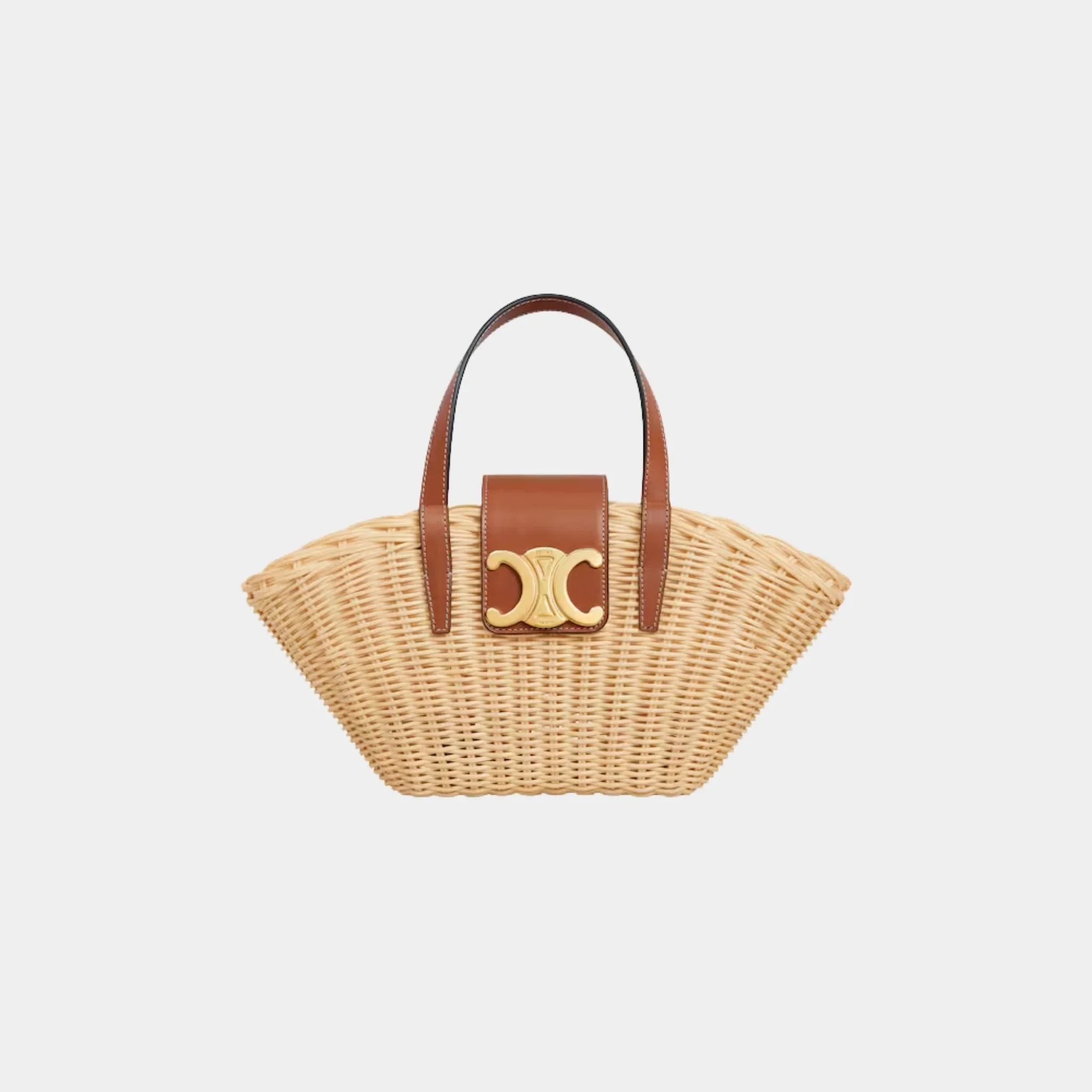 Crafted with hand-braided wicker and elevated with luxurious natural calfskin, this lightweight piece delivers both structure and ease. The gold-finished Triomphe magnetic flap closure adds a signature Celine touch, while the versatile carry options offer styling flexibility. Two leather handles provide a polished hand carry, and the removable strap adjusts for a more relaxed, crossbody fit. The unlined interior maintains the bag’s organic feel, making it an ideal companion for sun-drenched escapes or weekend styling.