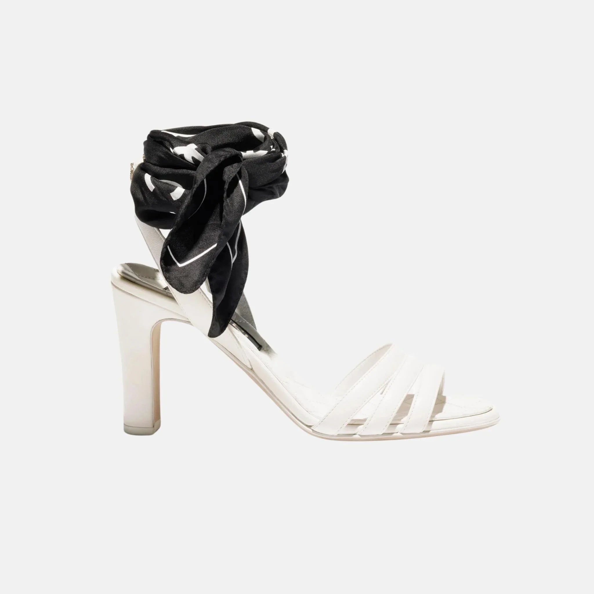 The Chanel Sandals in lambskin and silk are a stunning expression of refined elegance and modern femininity. Crafted in a timeless white and black combination, these sandals showcase the Maison’s mastery of texture and proportion. The soft lambskin provides a smooth, luxurious foundation, while delicate silk accents add a touch of sophistication and fluidity. Set on a graceful 90mm heel, these sandals strike the perfect balance between comfort and glamour ideal for both chic daytime looks and elegant evening wear.
