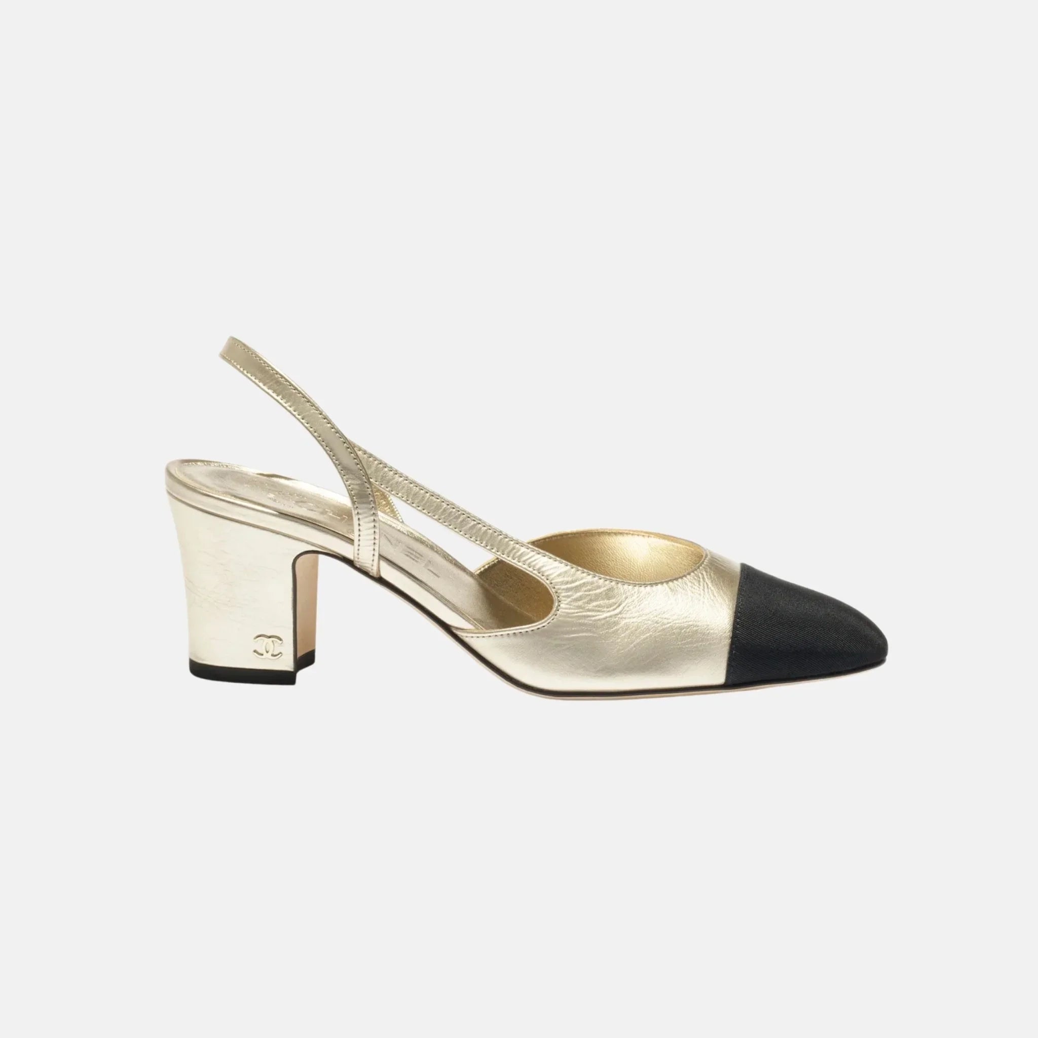 The Chanel Slingbacks in laminated lambskin and grosgrain blend classic elegance with a hint of modern glamour. Crafted in light gold and black, these shoes capture the essence of Chanel’s timeless aesthetic while adding a radiant, contemporary edge. The subtle shimmer of the laminated lambskin contrasts beautifully with the matte texture of the black grosgrain toe, creating a refined balance of texture and tone. With a 65mm heel, these slingbacks offer both sophistication and comfort perfect for elevating any outfit with effortless grace.