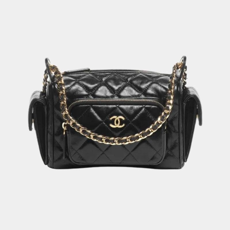 The Small Camera Case is crafted from premium shiny crumpled lambskin, offering a textured and luxurious finish. The gold-tone metal accents add a refined touch, enhancing its overall aesthetic. With dimensions of 13 x 23 x 15 cm, it is spacious enough for your daily essentials while remaining compact and lightweight for convenient use.