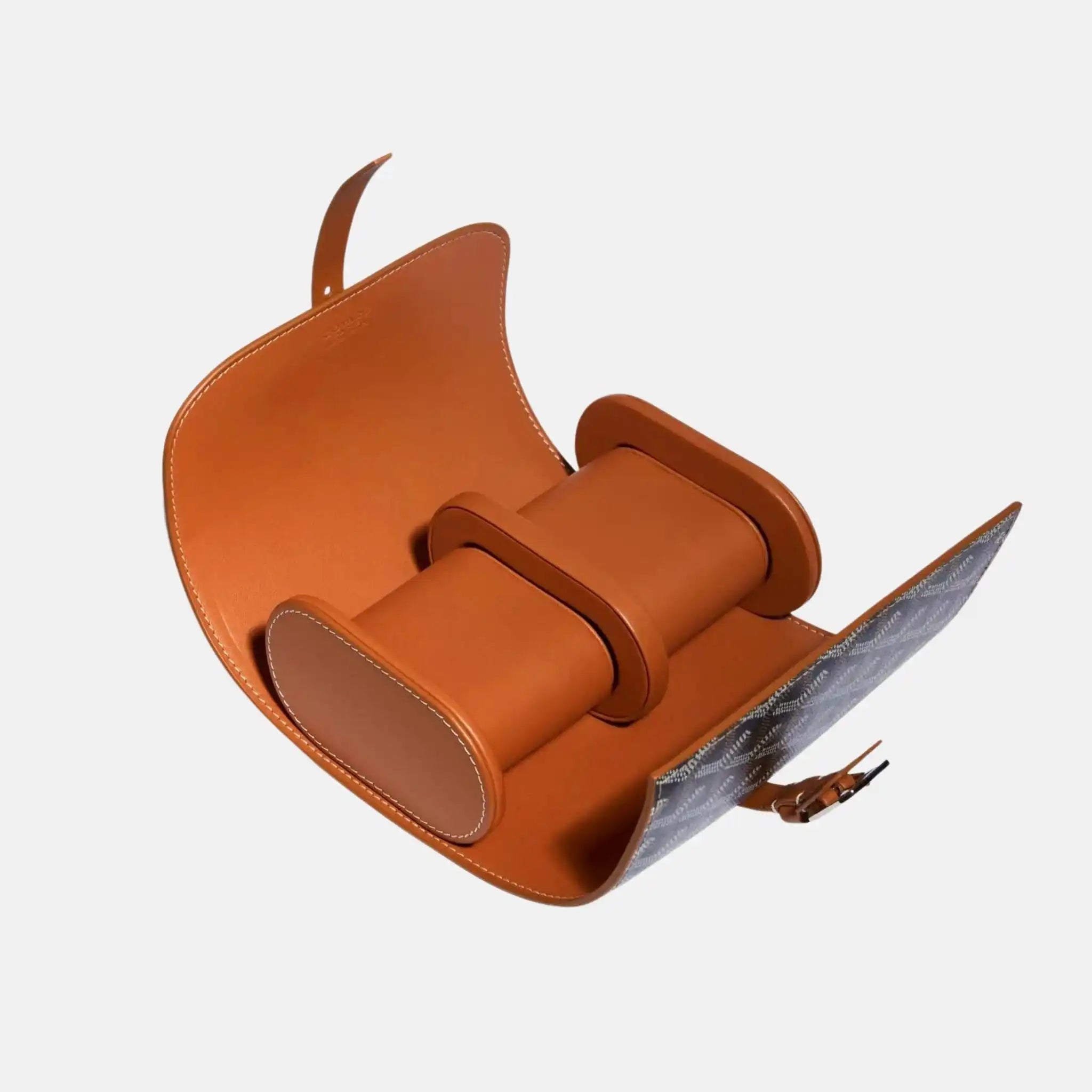 Built to preserve the integrity of your watches, this case is equipped with two interior leather cushions that cradle each timepiece individually. A leather strap with a flat buckle fastening ensures a secure closure, while the palladium-finish hardware adds a discreet touch of luxury. The combination of Goyardine canvas, Clamecy cowhide, and soft Vézelay lambskin lining provides both durability and gentle protection.