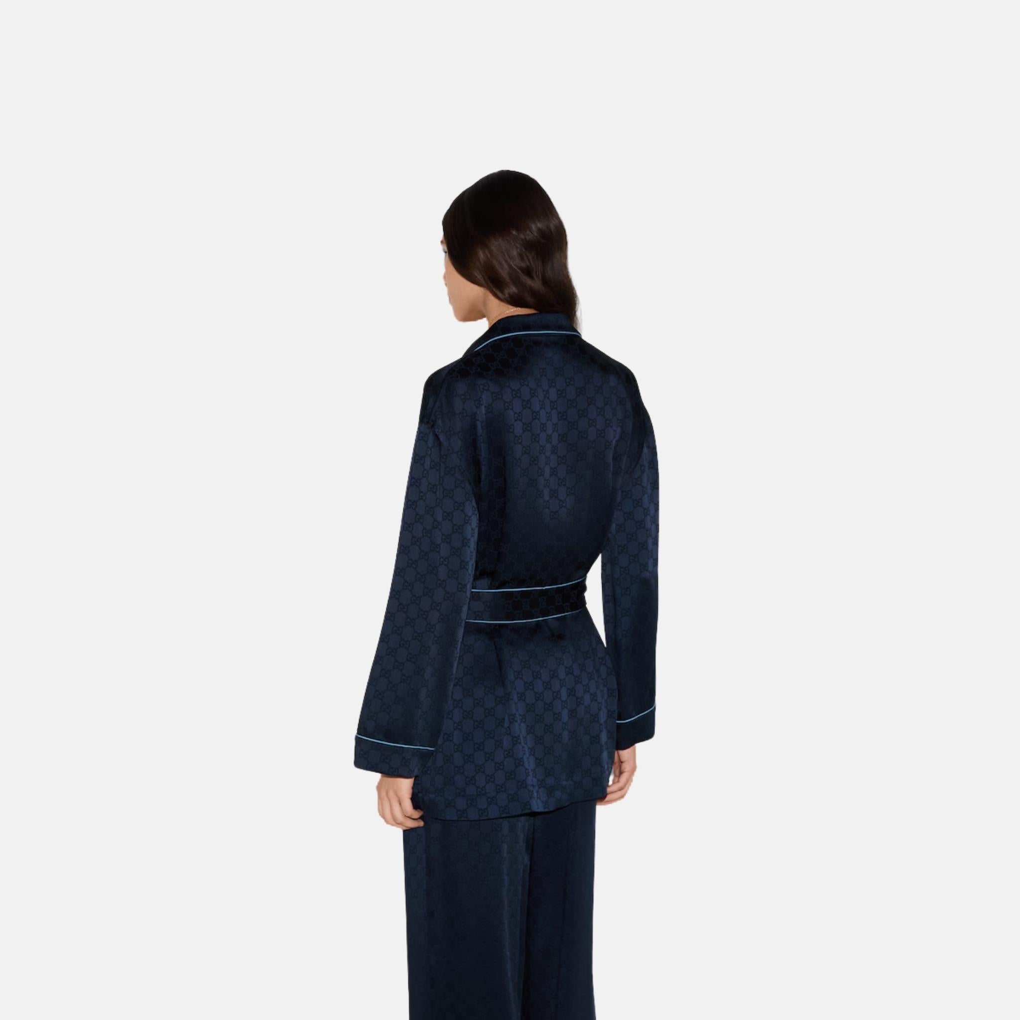 The Gucci GG Satin Shirt reinterprets classic elegance with a luxurious, modern twist. Crafted from dark blue GG satin and accented with light blue crêpe de chine piping, this shirt celebrates the House’s iconic monogram while delivering a polished yet relaxed look. Its silky texture and refined detailing make it a standout addition to sophisticated wardrobes.