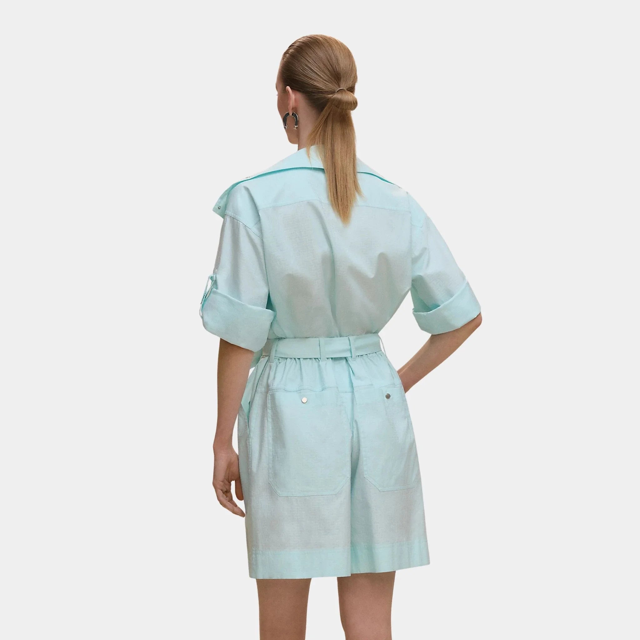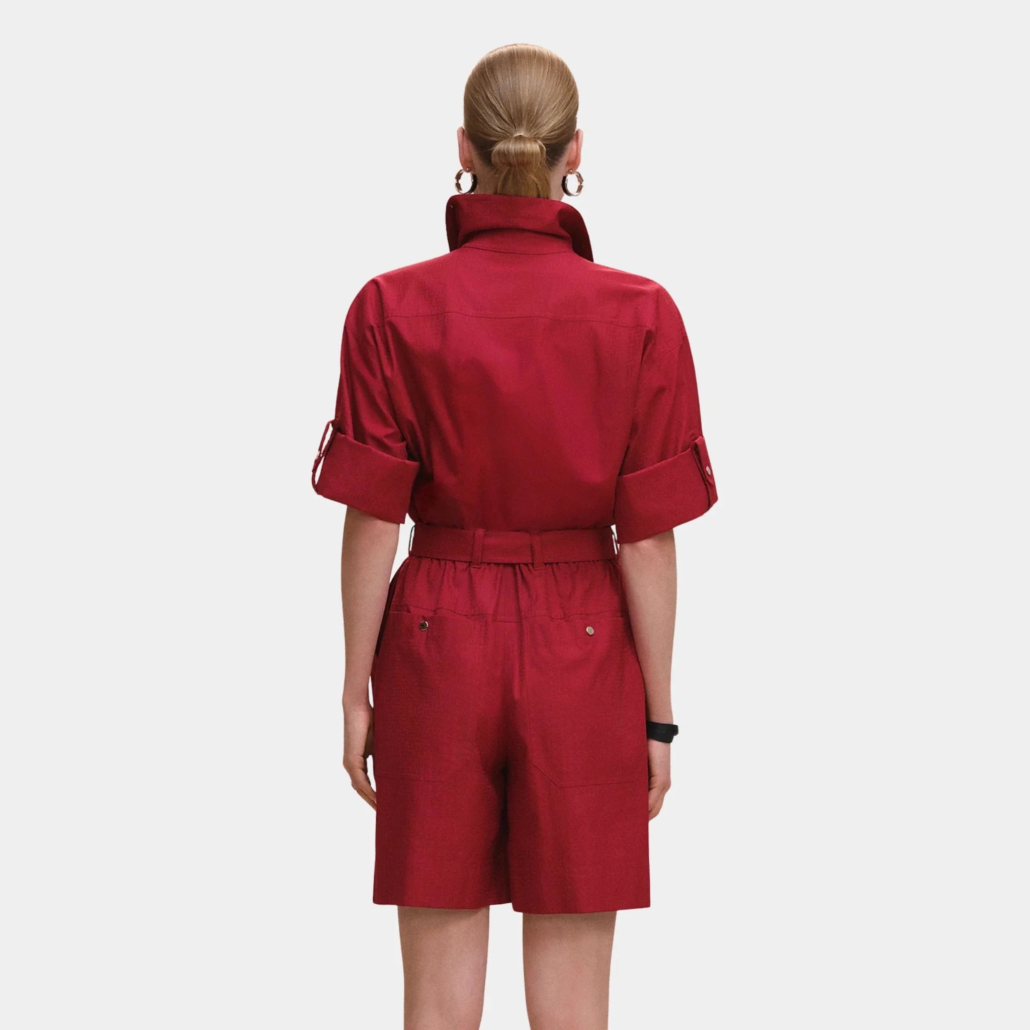 Hermes has redefined the combishort with meticulous detailing that embodies couture-level craftsmanship. A palladium-plated zip with self-locking pull-tab ensures a secure and elegant closure, while Clou de Selle–engraved snap closures and horn buttons add distinctive touches of house heritage. The refined tailoring combined with breathable cotton gauze fabric makes this designer one-piece an essential addition to any luxury wardrobe.