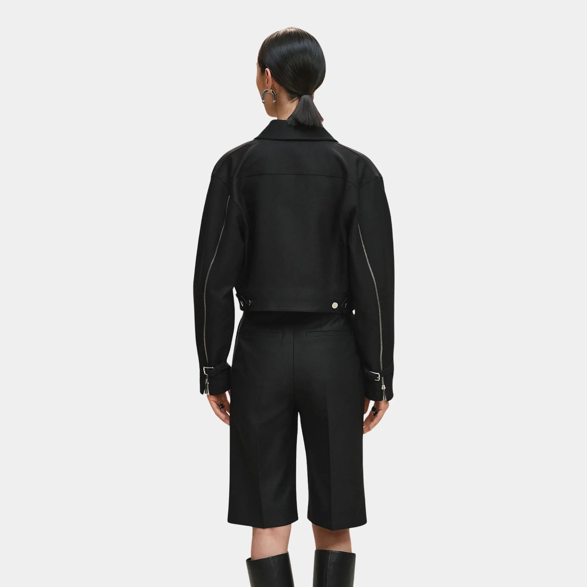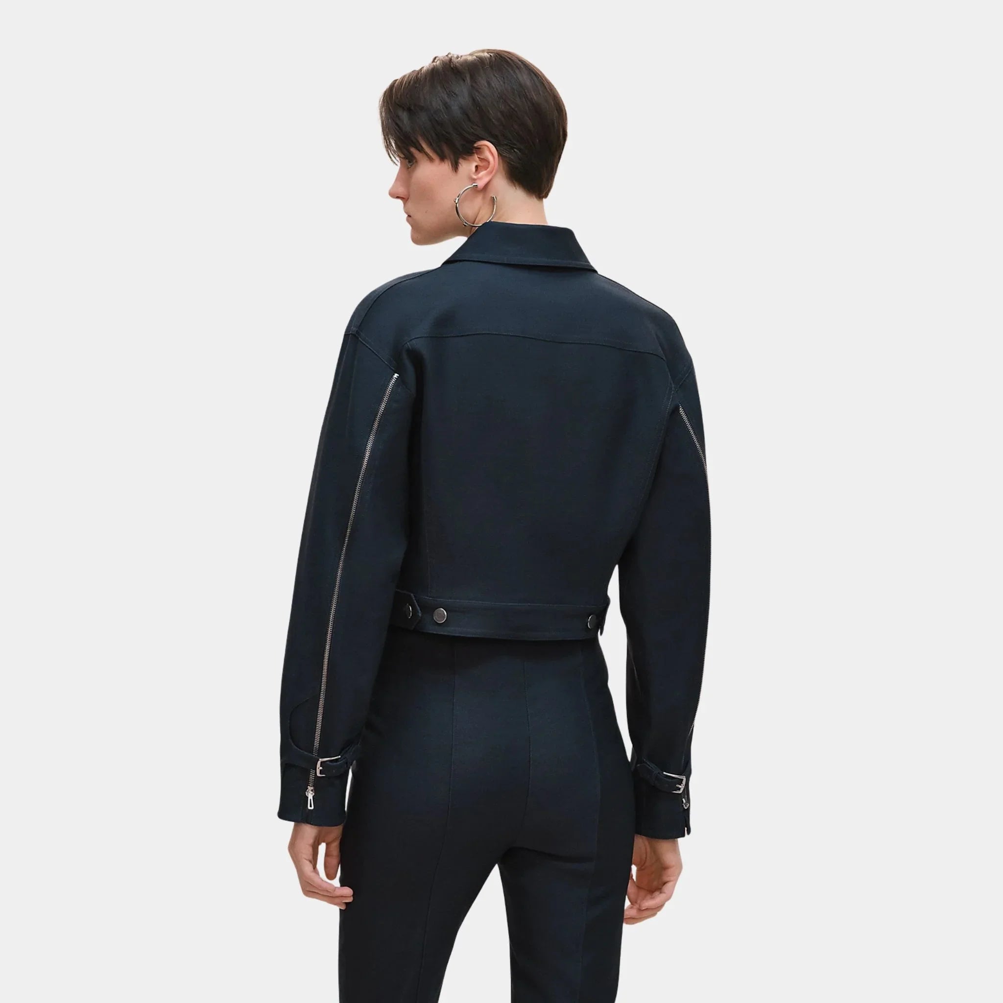 Hermes elevates denim-inspired design with couture-level precision and signature house codes. A coat collar frames the silhouette, while palladium-plated zips at the front and cuffs highlight both function and refinement. The chest pockets with wool flaps nod to utility with a refined twist, while the adjustable hem with palladium-plated denim buttons ensures a tailored fit. Cuffs feature wool tightening tabs finished with palladium-plated stirrup buckles, echoing Hermes’ equestrian heritage.