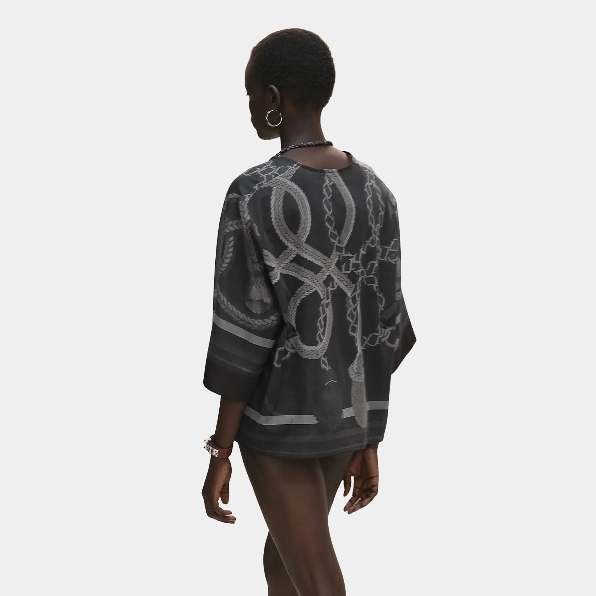 Hermes Maxi Beach Blouse with Palefroi Remix Print, Gris Charbon, Front