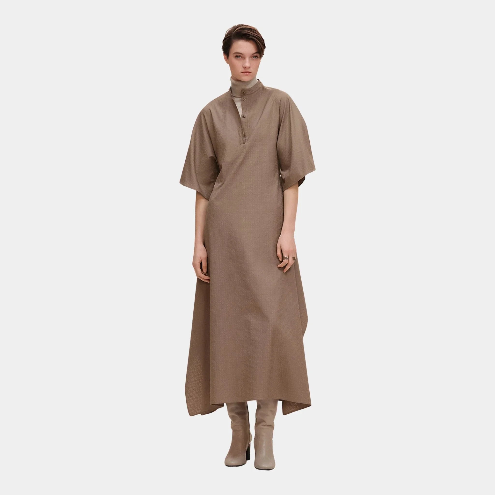 Hermes elevates the prairie dress with refined tailoring and couture-level finishing. The hidden button placket is secured with Clou de Selle engraved mother-of-pearl buttons, reflecting discreet elegance. A knotted gauze belt at the waist, in matching Mosaique print, accentuates the silhouette with refined definition. Light, breathable, and versatile, this dress reimagines classic femininity through Hermes’ lens of luxury craftsmanship.