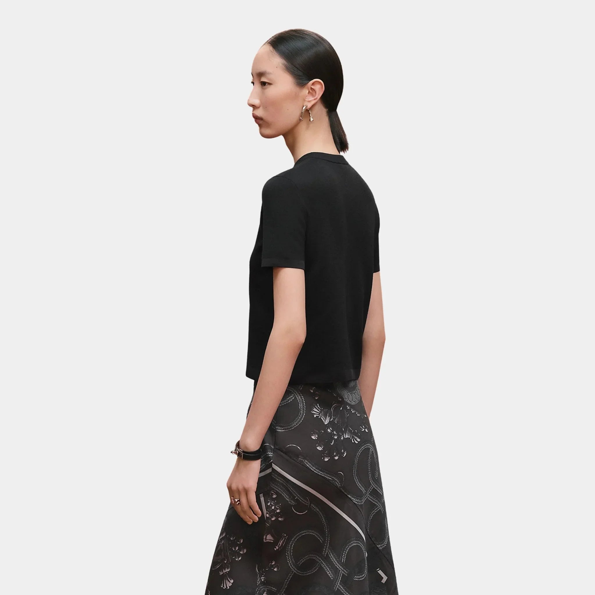 The Hermes Palefroi Remix Short-sleeve Sweater in Knit is a refined piece that blends heritage inspiration with modern elegance. Featuring a cable stitch pattern derived from the iconic Palefroi Remix design, this sweater captures Hermes’ commitment to artisanal craftsmanship. Woven in a luxurious blend of silk, cashmere, polyamide, and elastane, it offers both softness and structure, making it a versatile statement in luxury knitwear.