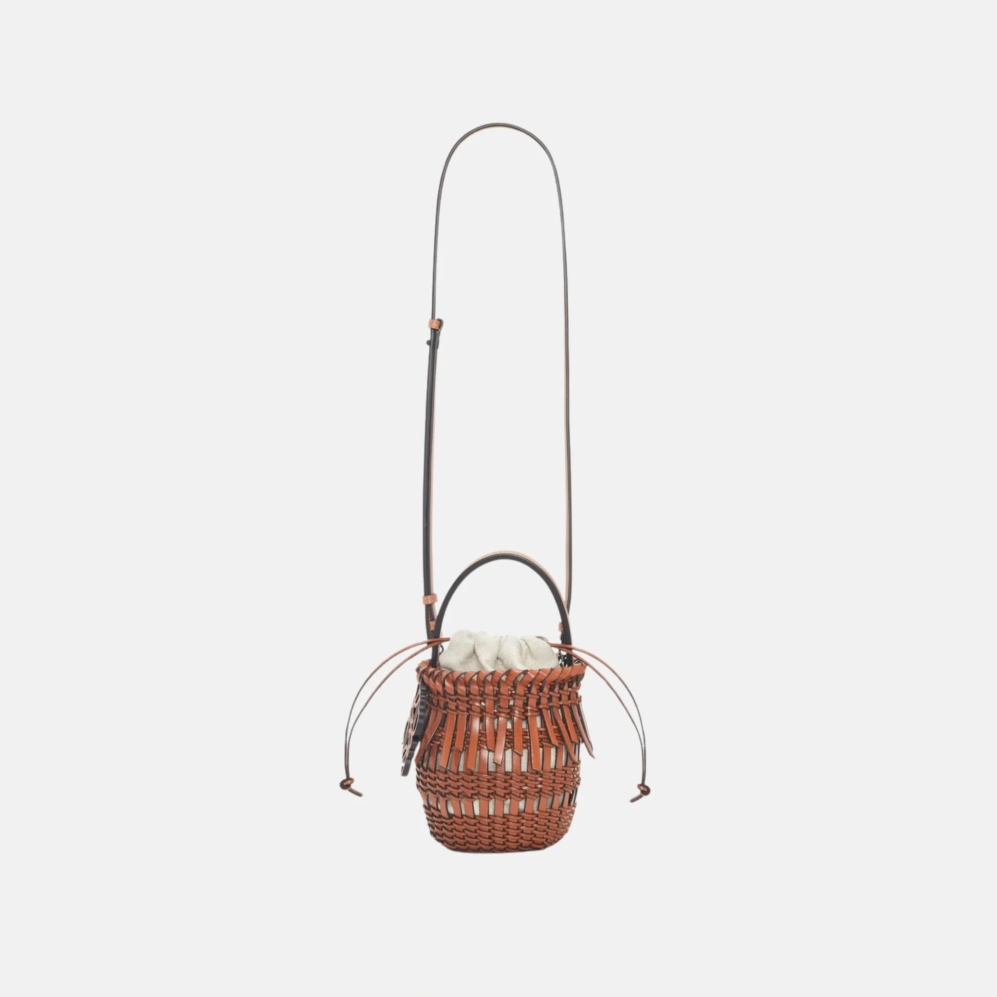 Meticulously handwoven in calfskin, the bucket bag’s structural silhouette is enhanced by a top fringe finish that adds movement and texture. The design includes a drawstring pouch for securing belongings and a detachable shoulder strap, allowing versatile carry options. A hanging Anagram charm in gold-tone metal completes the look with Loewe’s signature finesse.