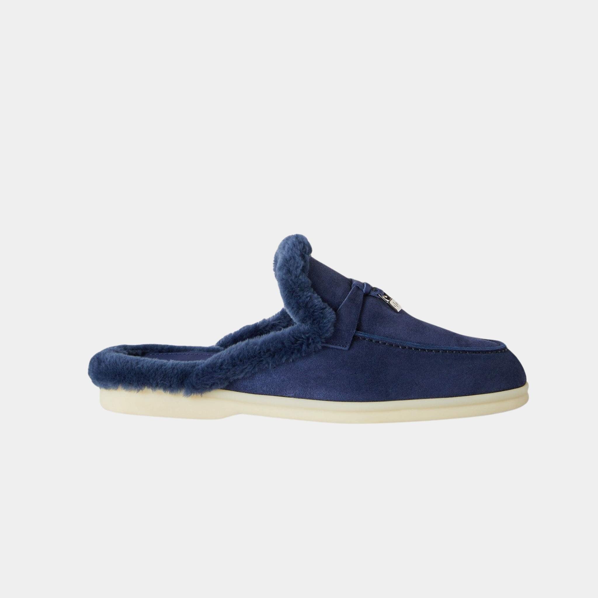 Loro Piana Charms Walk Babouche Suede Loafer With Soft Fur Lining, Midnight Blue, Side Charms Walk Babouche Suede Loafer With Soft Fur Lining