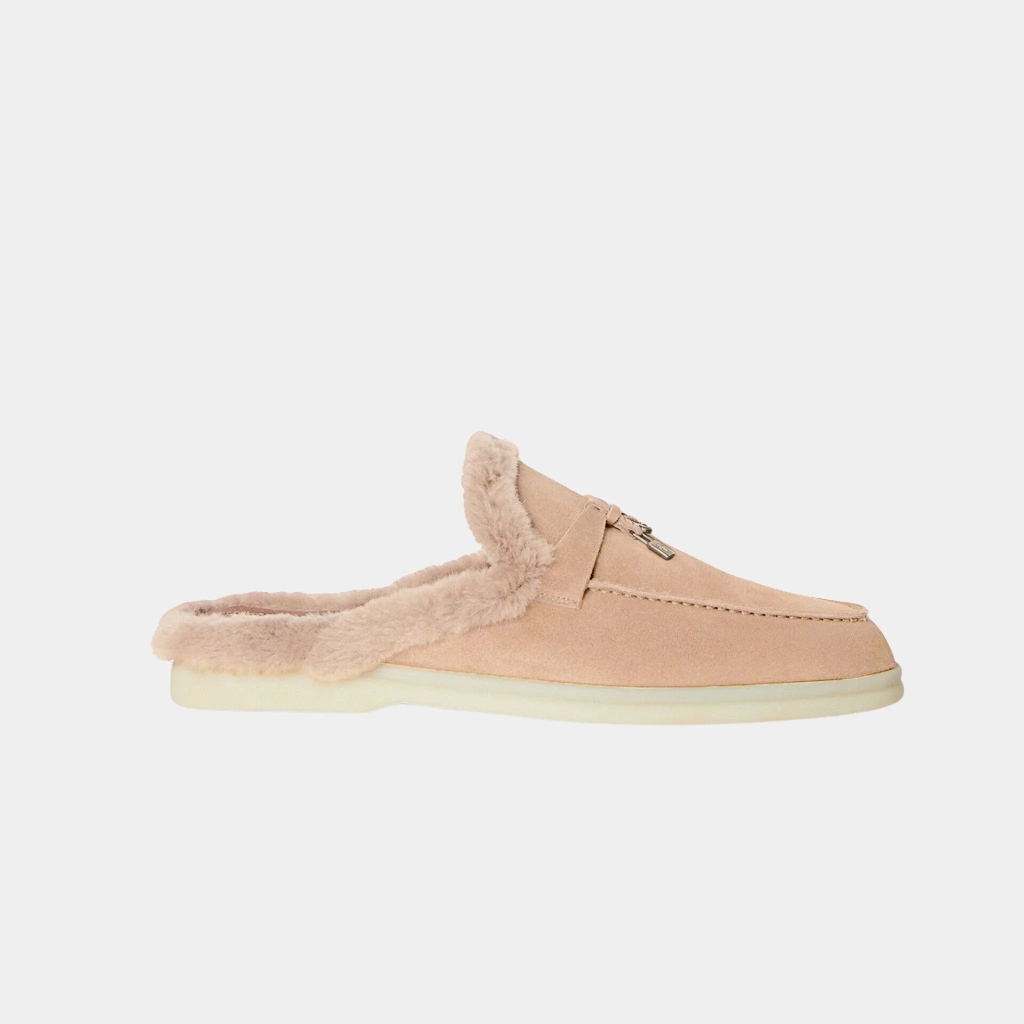 Loro Piana Charms Walk Babouche Suede Loafer With Soft Fur Lining, Powder Pearl, Side
