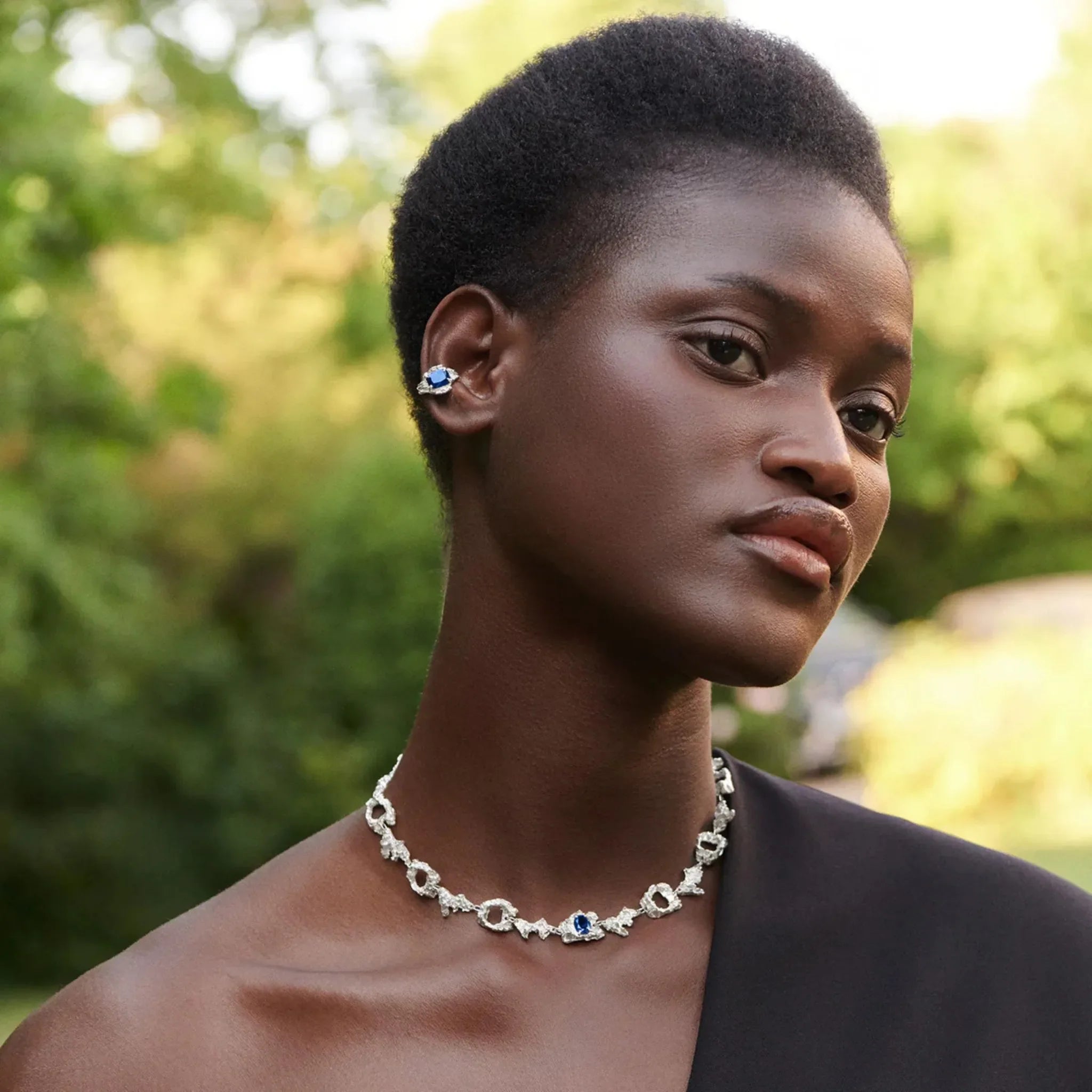 The Loveness Lee Eryngii Sapphire Argenti Necklace is a bold and expressive statement piece inspired by the forms and textures of wild mushrooms. Handmade in London, this striking choker features a repeating pattern of abstract mushroom-inspired shapes that lead to a vivid oval lab-grown sapphire at the centre. The interplay of polished silver tones and sculptural textures creates depth, movement, and visual interest. Crafted from certified recycled sterling silver and paired with a sustainably grown sapphire, it reflects the brand’s commitment to ethical craftsmanship. With an adjustable 12–16 inch chain, this necklace brings power, confidence, and a touch of natural artistry to jewellery lovers across the UAE.