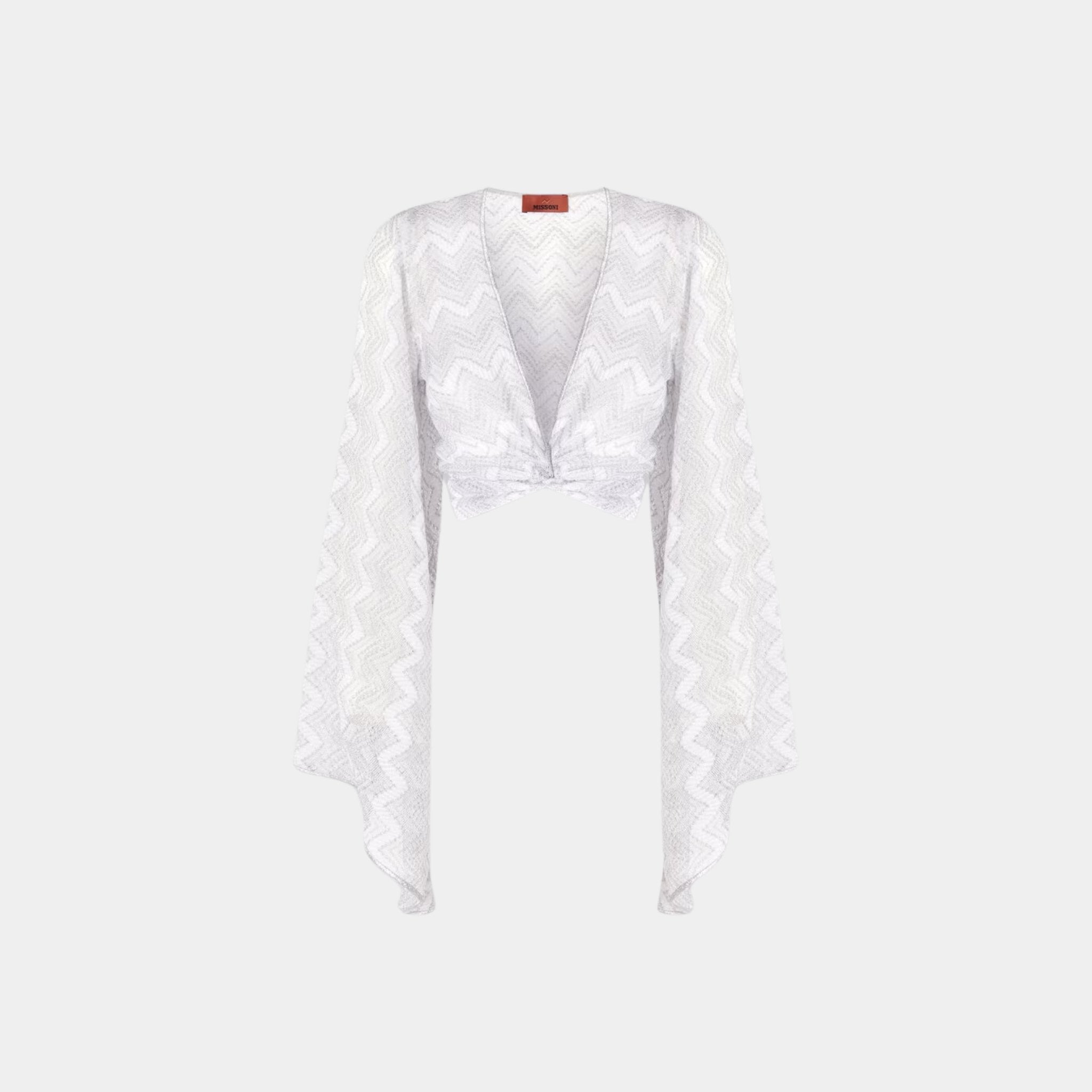The Missoni Crop Top in Zigzag Lamé Viscose is a bold and sophisticated statement piece that balances dramatic volume with sensual detailing. Designed for women who embrace confident, high-fashion styling, this crop top features Missoni’s iconic zigzag pattern, wide statement sleeves, and a front knot that accentuates the waistline. The lightweight viscose fabric with metallic lamé accents adds a luminous elegance, making it the perfect choice for both day and evening wear.