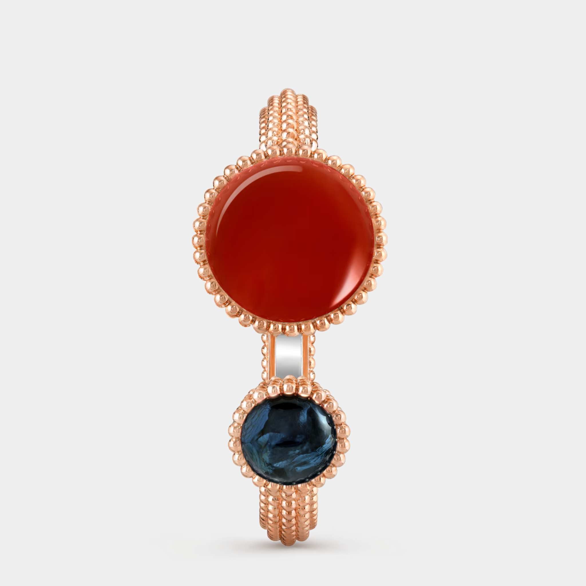 The Perlée Toi & Moi Secret Watch in Rose Gold is a stunning fusion of jewelry and timekeeping, designed for women who value elegance and functionality. Crafted in 18K rose gold, this small model features a 25 mm case with a bezel set with 25 sparkling diamonds (0.77 carats). The watch is adorned with exquisite carnelian, black pietersite, and white mother-of-pearl, creating a sophisticated and unique accessory. Ideal for special occasions or everyday luxury, this secret watch enhances any outfit with its timeless charm.