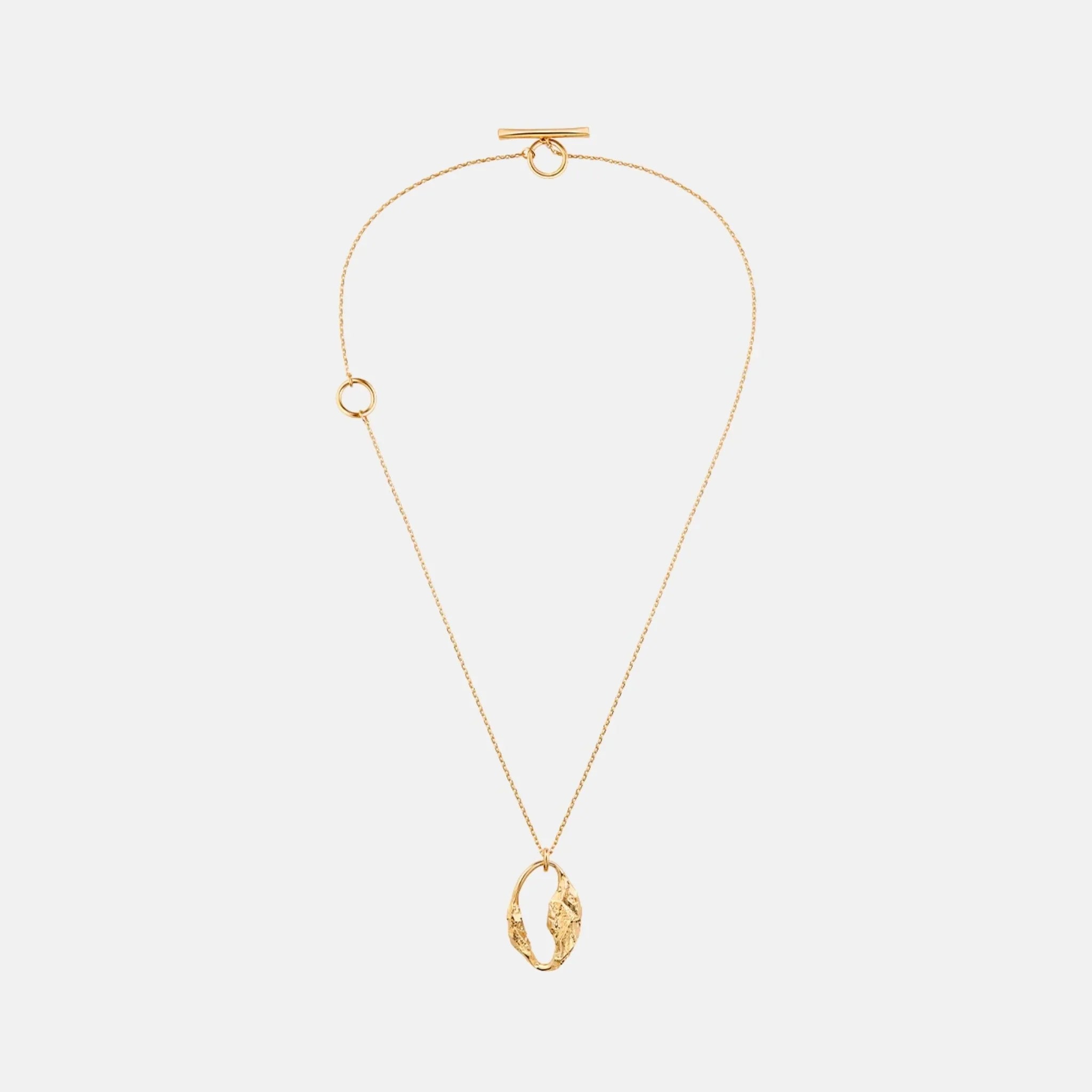 The Polène Éroz Pendant 24 Carat Gold Gilded Edition brings together delicacy and raw elegance. Featuring a fine chain with an organic, hollow pendant, it allows the natural beauty of bare skin to show through its sculptural form. Its minimalist yet intricate rocky texture gives it an artisanal character that feels both timeless and modern.