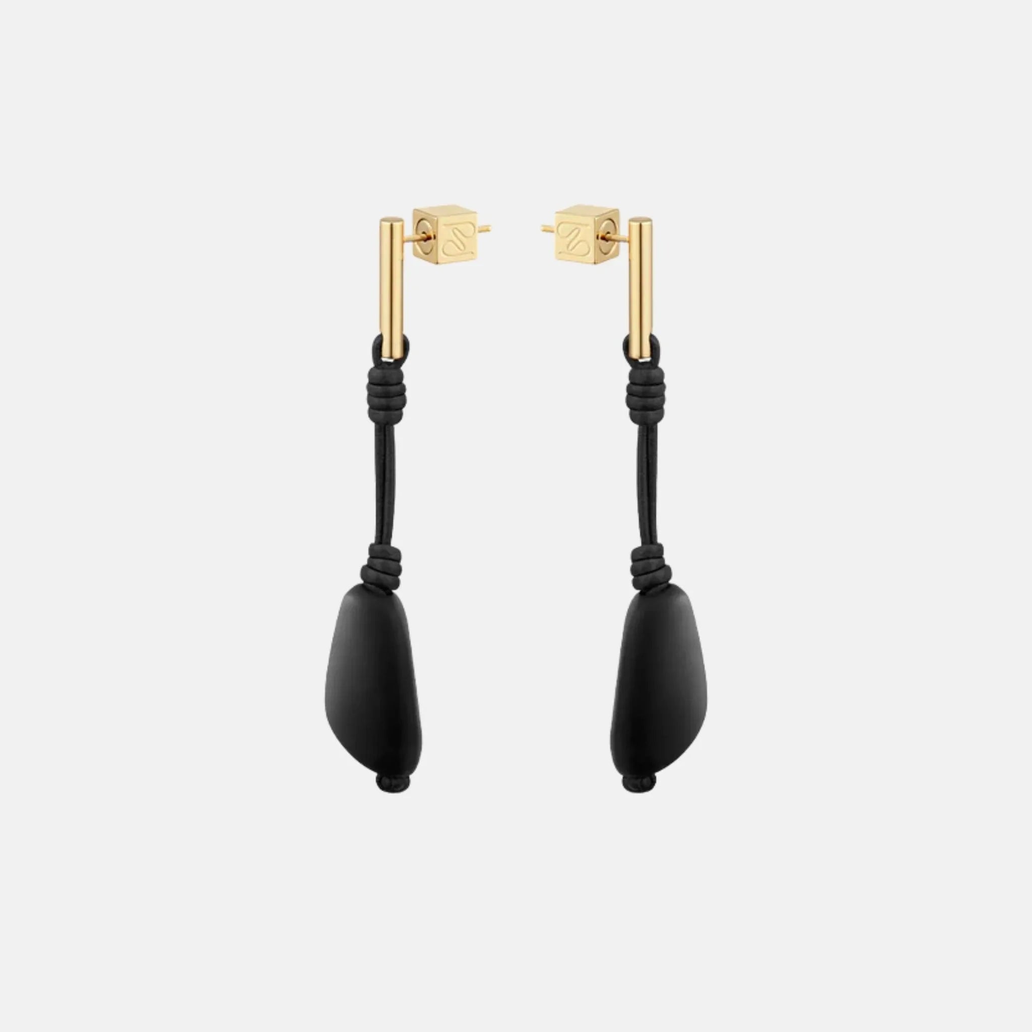 The Polène Téré Drop Earrings Black Marble Edition feature sculpted black marble pebbles delicately secured with hand-knotted leather cording. Their organic design echoes the natural beauty of beach pebbles, elevated by polished details and golden accents.