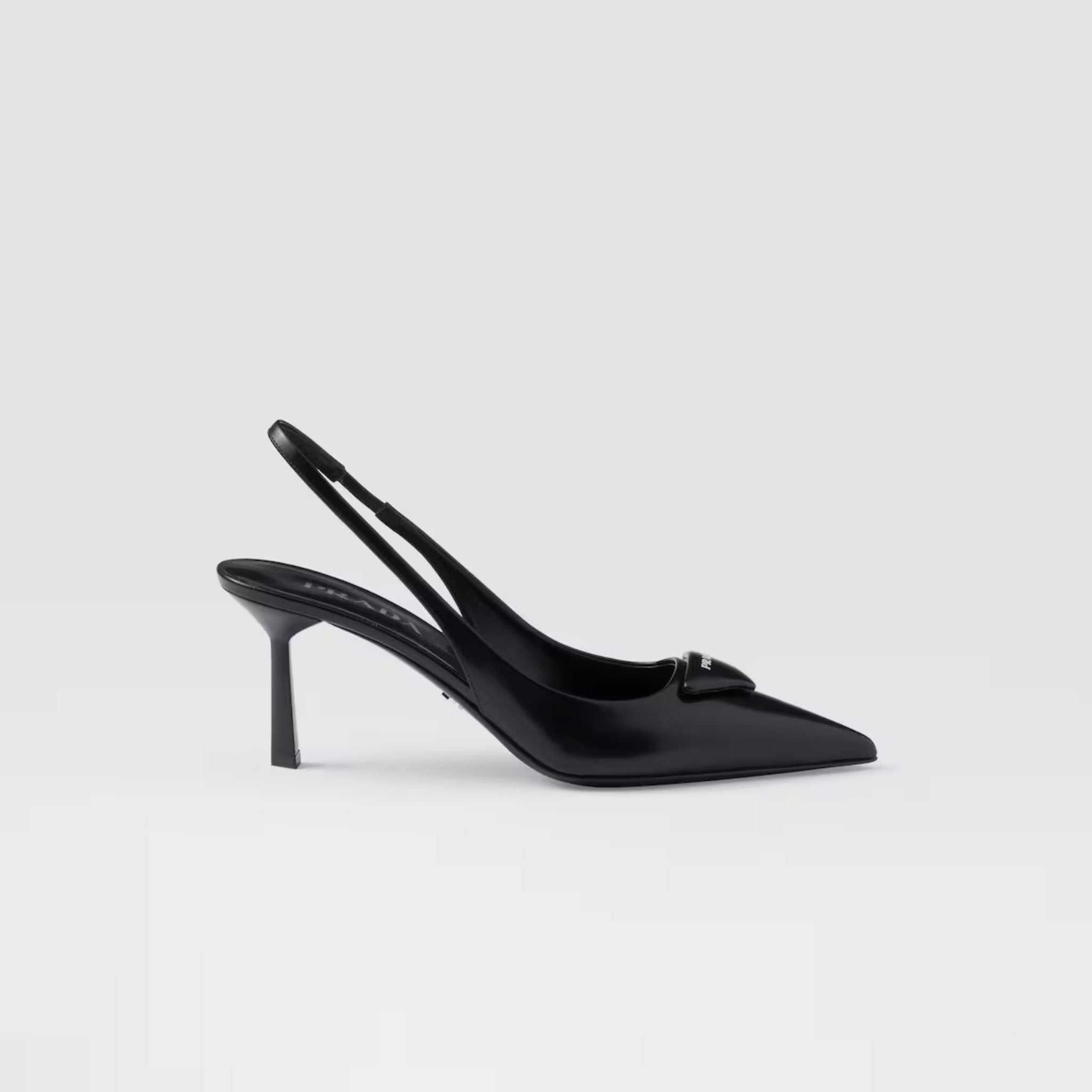 Made from high-quality brushed leather, these pumps offer a smooth, polished finish, reflecting Prada’s heritage in luxury footwear. The 75 mm sculptural varnished heel creates a bold yet balanced lift, while the leather sole with a metal lettering logo ensures durability and traction. Designed for both statement styling and everyday sophistication, these slingback pumps are a must-have for modern, fashion-forward wardrobes.