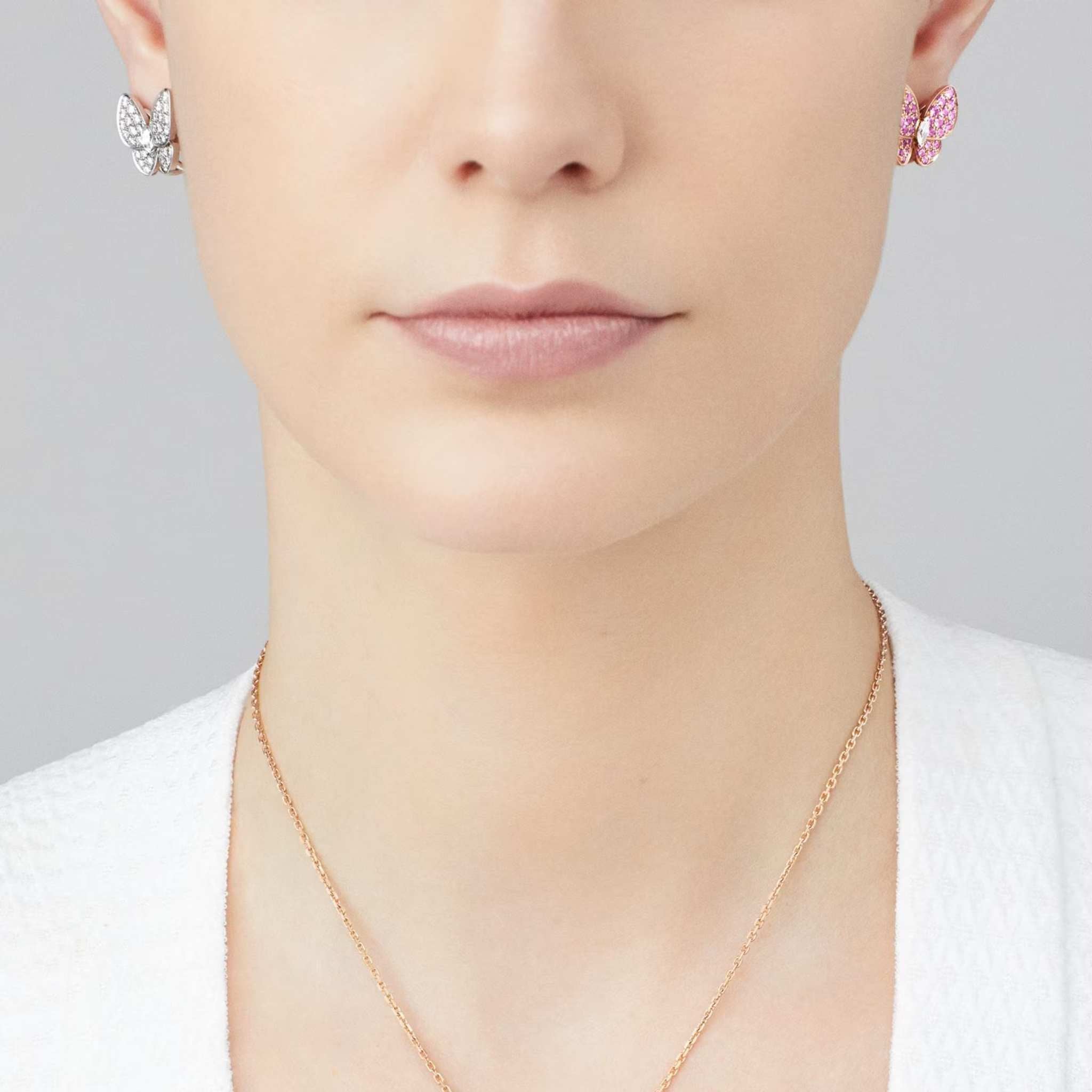 The Van Cleef & Arpels Two Butterfly Between The Finger Ring in rhodium-plated 18K white gold is an exquisite example of the Maison's dedication to timeless craftsmanship and design. Featuring 36 diamonds totaling 0.99 carats (DEF quality, IF to VVS clarity) and 34 pink sapphires totaling 0.88 carats, this ring captures the ethereal beauty of butterflies in flight.