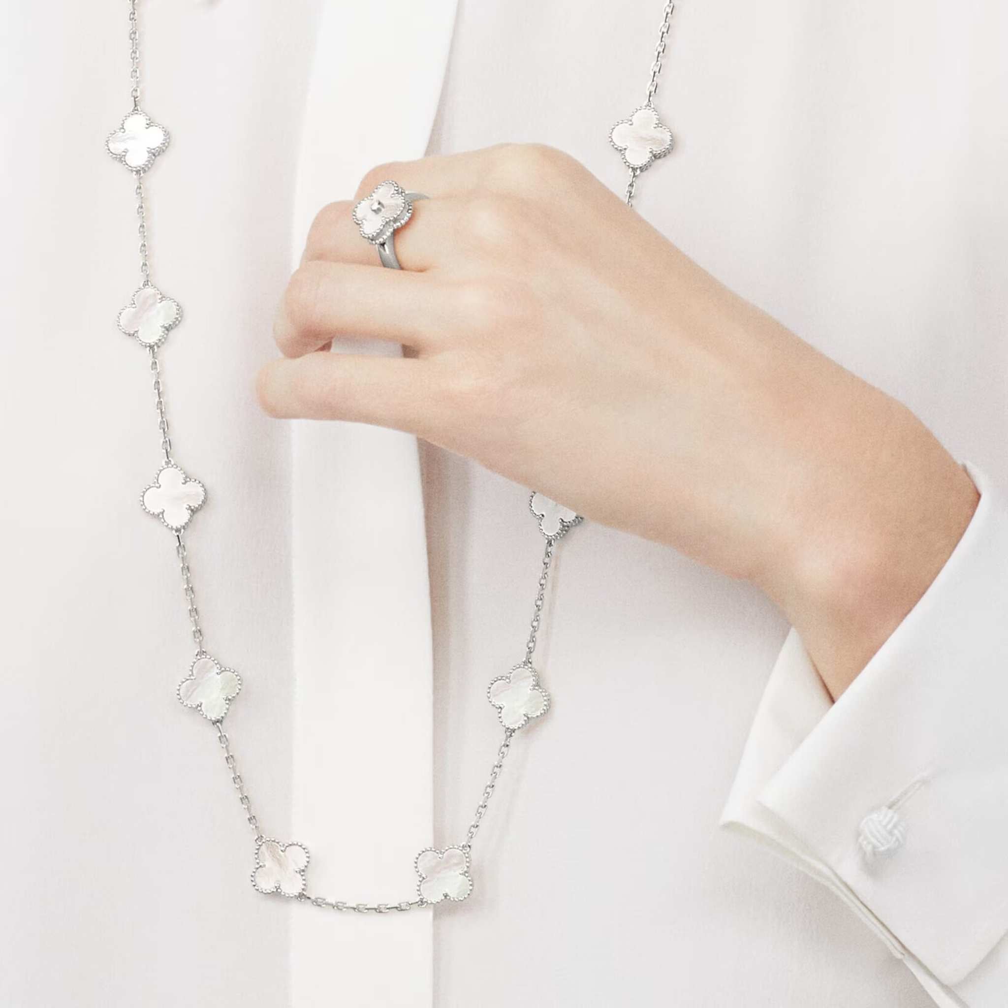 The Vintage Alhambra Long Necklace is a versatile accessory designed to enhance any wardrobe. The soft iridescence of the white mother-of-pearl pairs beautifully with the sleek white gold, creating a timeless piece suitable for both casual and formal occasions. Its 86 cm chain length allows for multiple styling options—wear it long as a statement piece or double it for a layered look.