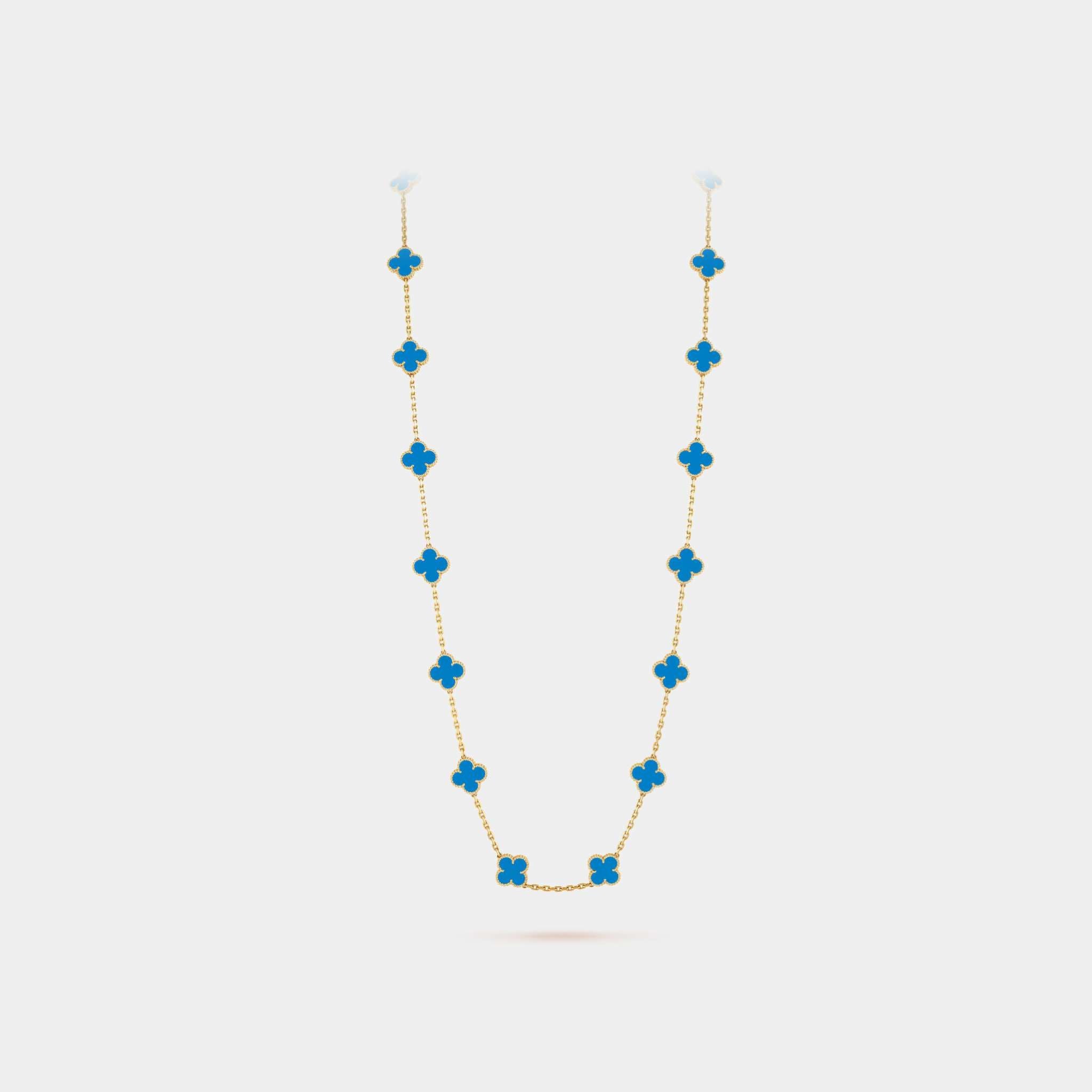 The Magic Vintage Alhambra Long Necklace enhances any ensemble with its vibrant blue agate stones and warm yellow gold. Its 86 cm chain length allows for versatile styling—wear it long for a bold look or double it for a layered effect. Whether paired with casual attire or evening wear, this necklace adds a touch of refinement and elegance to any occasion.